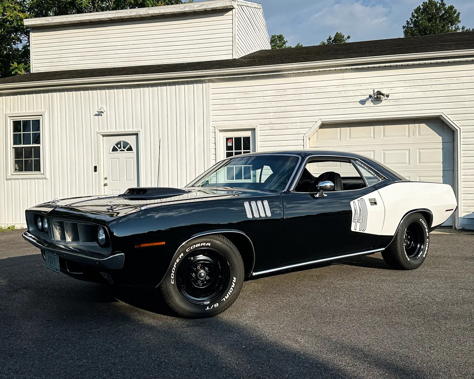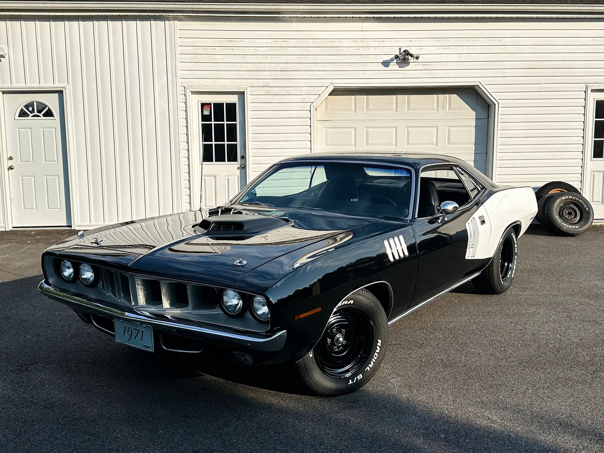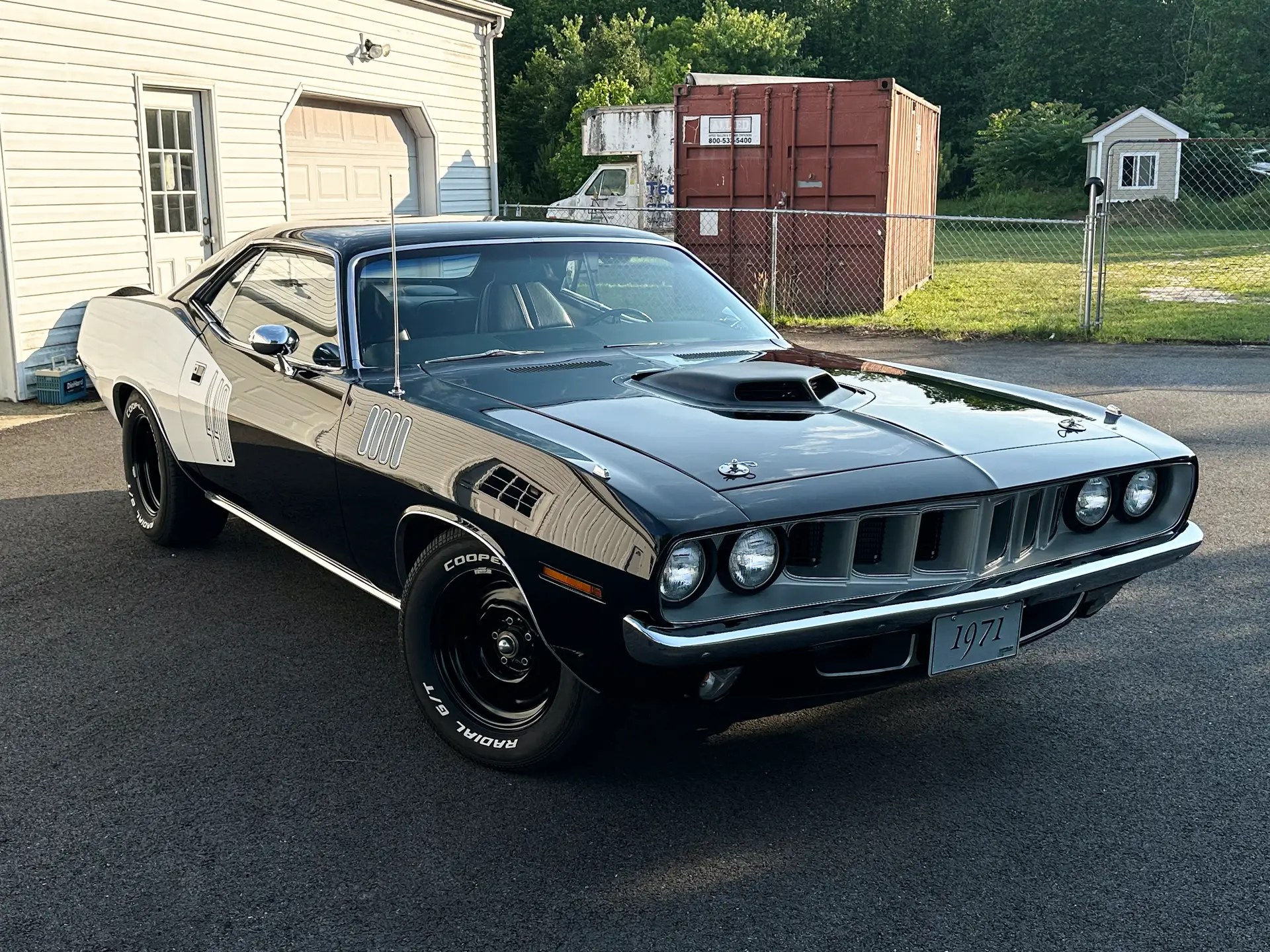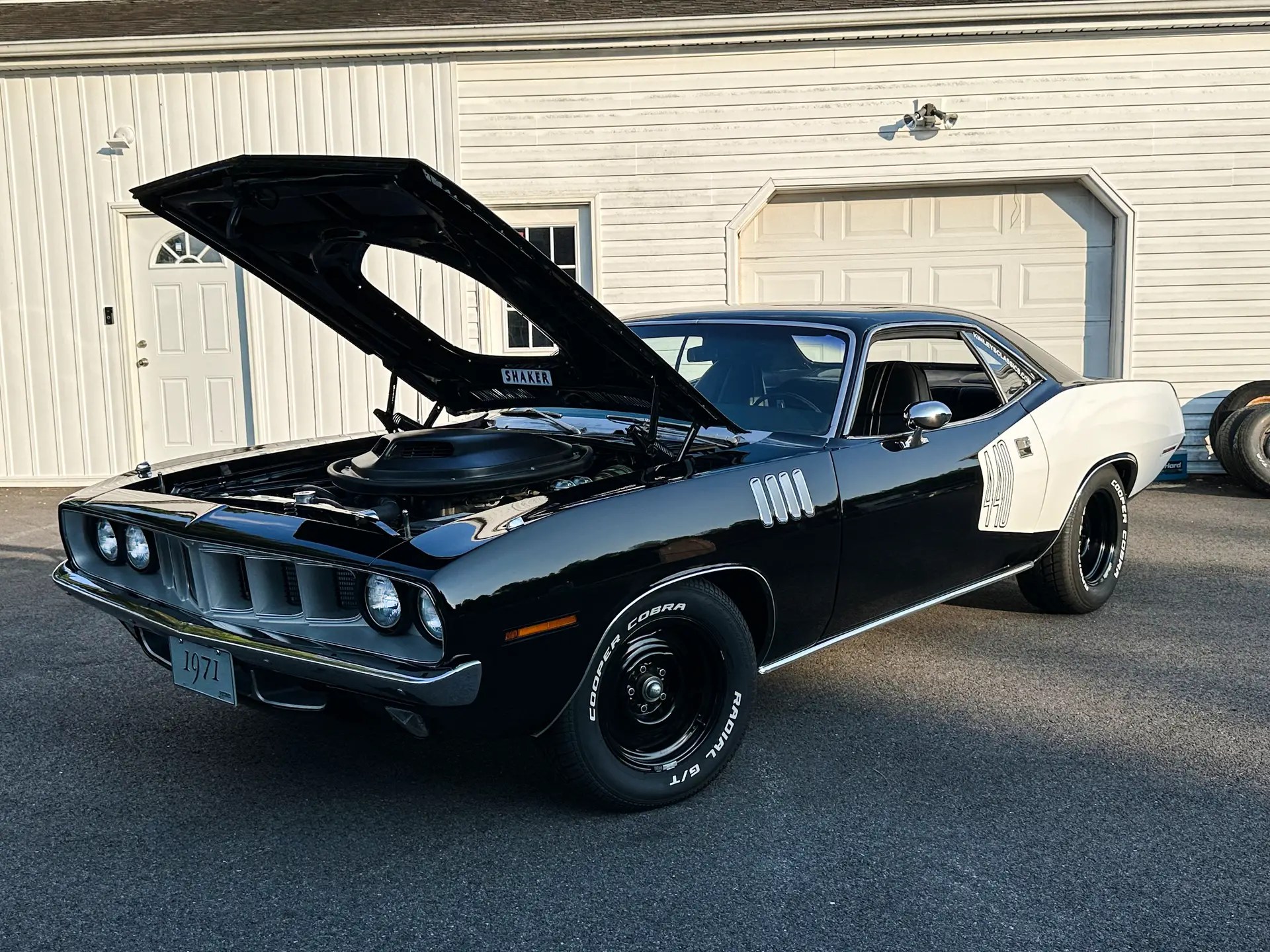 1971 Barracuda, originally a G code 318 car, now upgraded with a FiTech EFI 440+6 setup. It was born FE5 Rallye Red but has been repainted in TX9 black, accented by white 440 billboard decals.