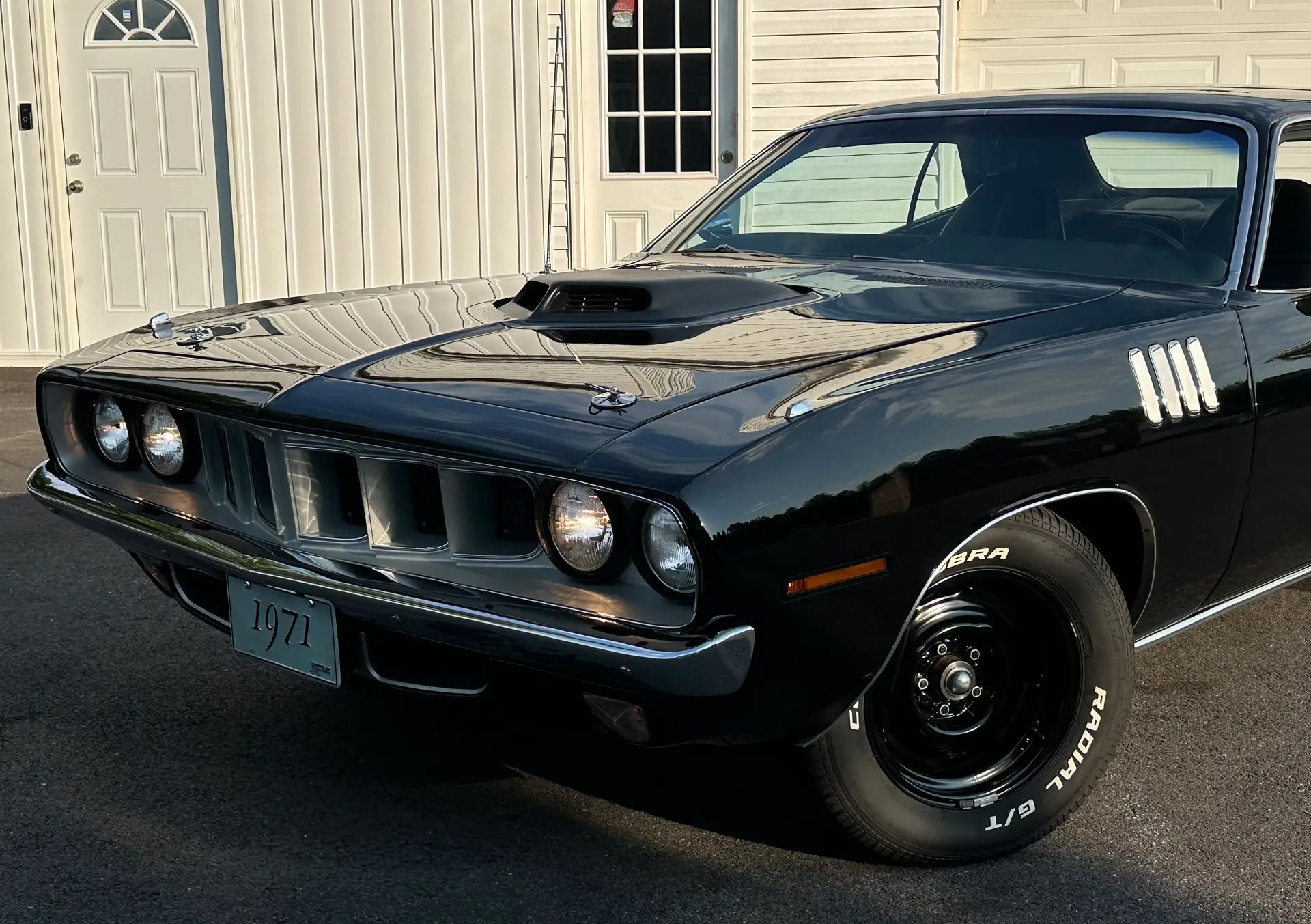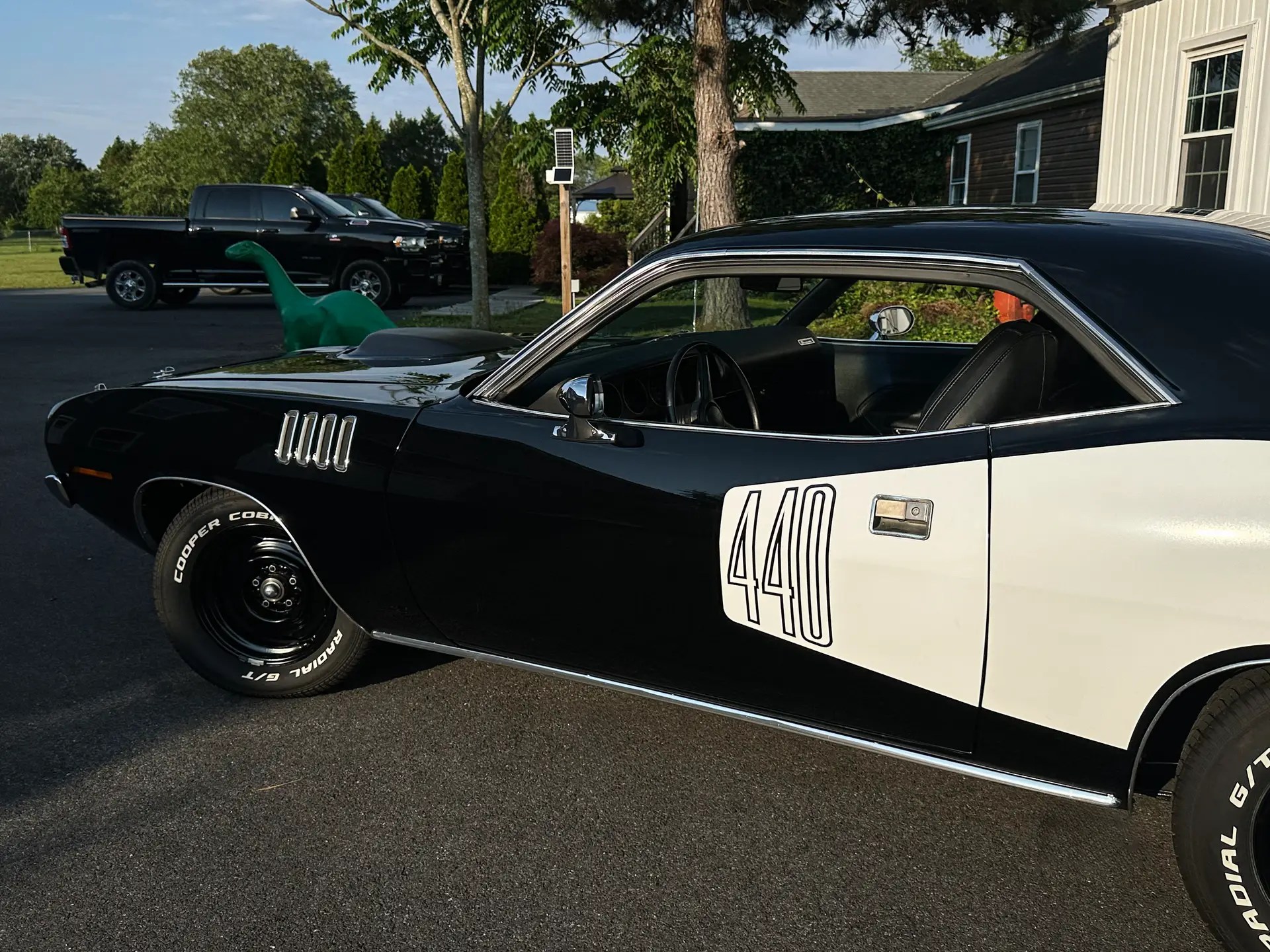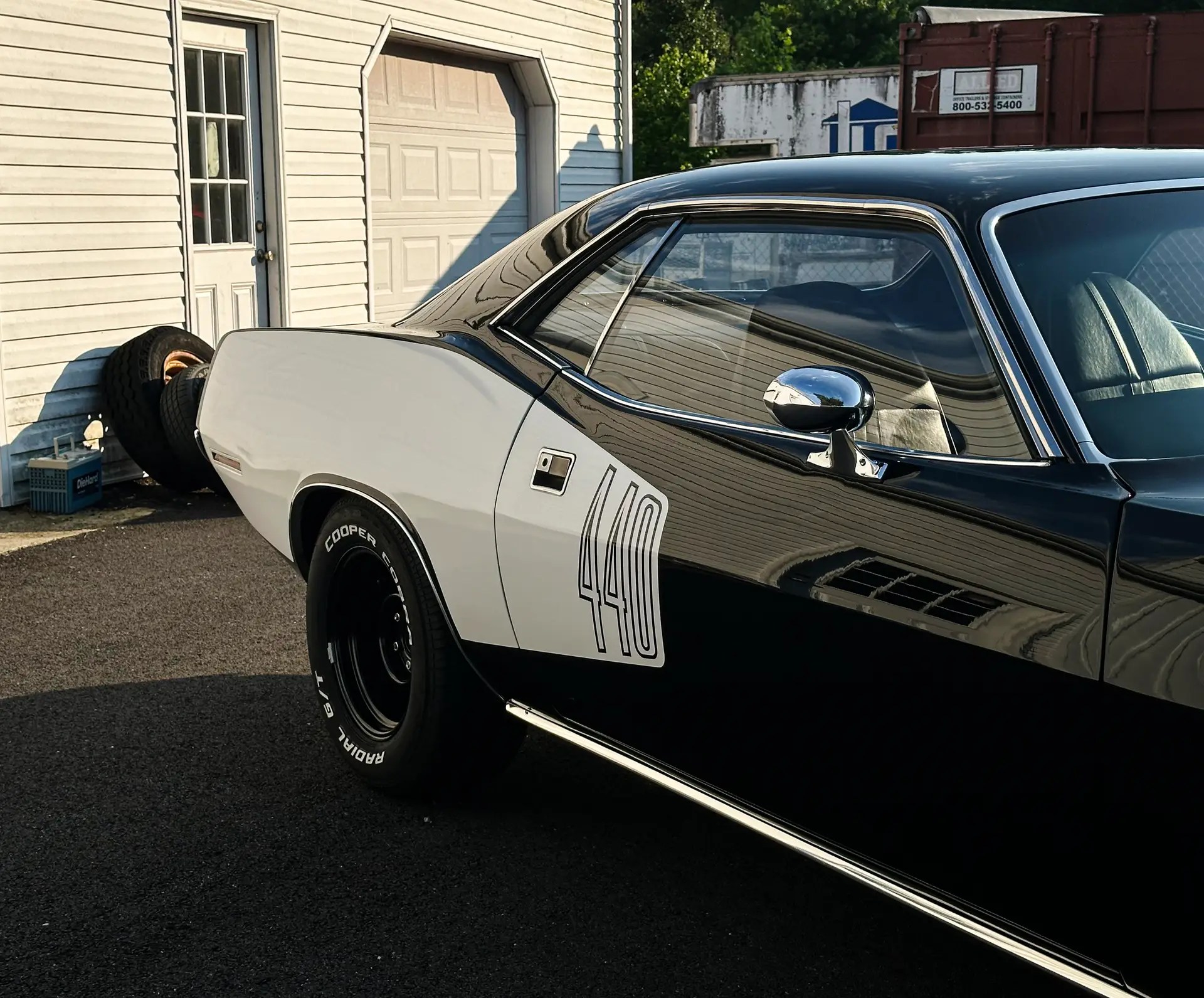 1971 Barracuda, originally a G code 318 car, now upgraded with a FiTech EFI 440+6 setup. It was born FE5 Rallye Red but has been repainted in TX9 black, accented by white 440 billboard decals.