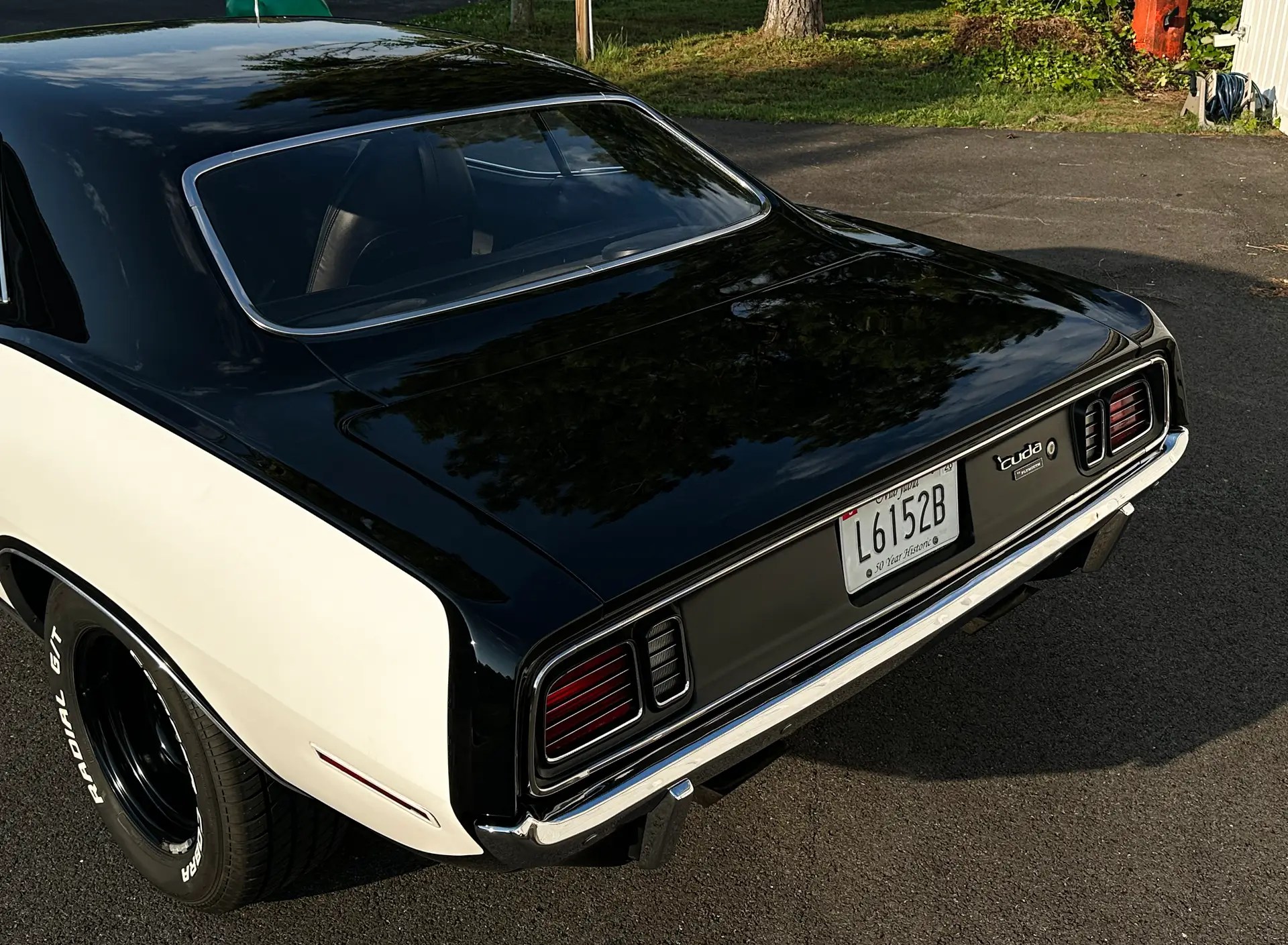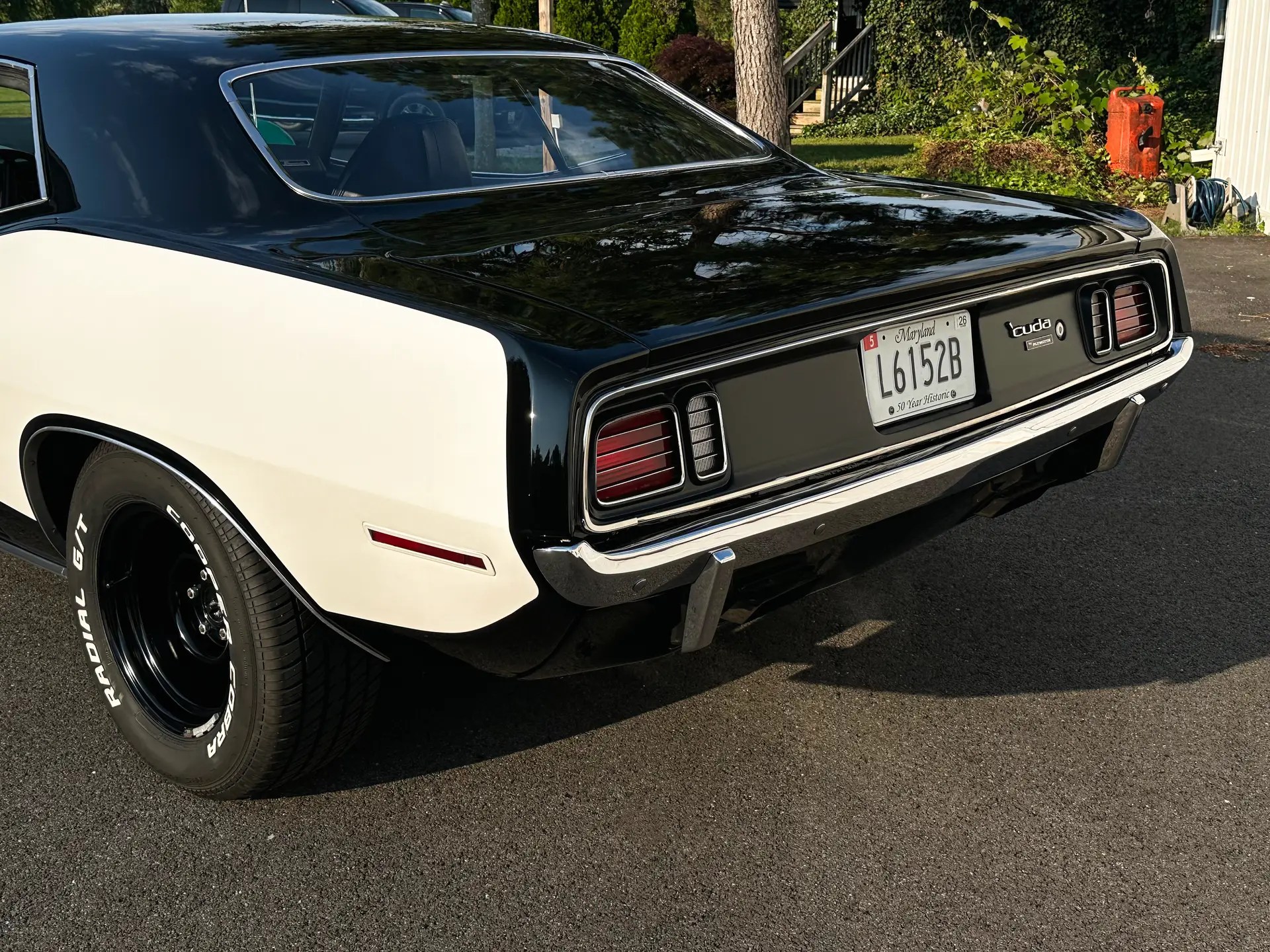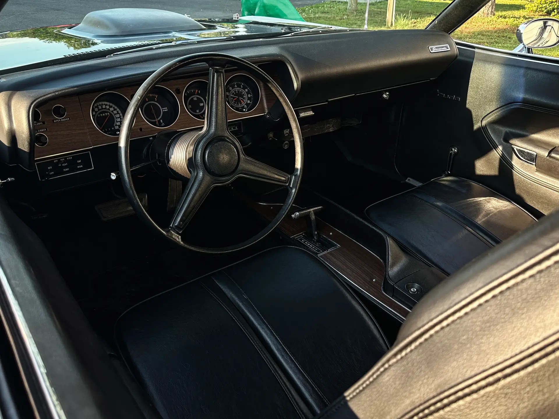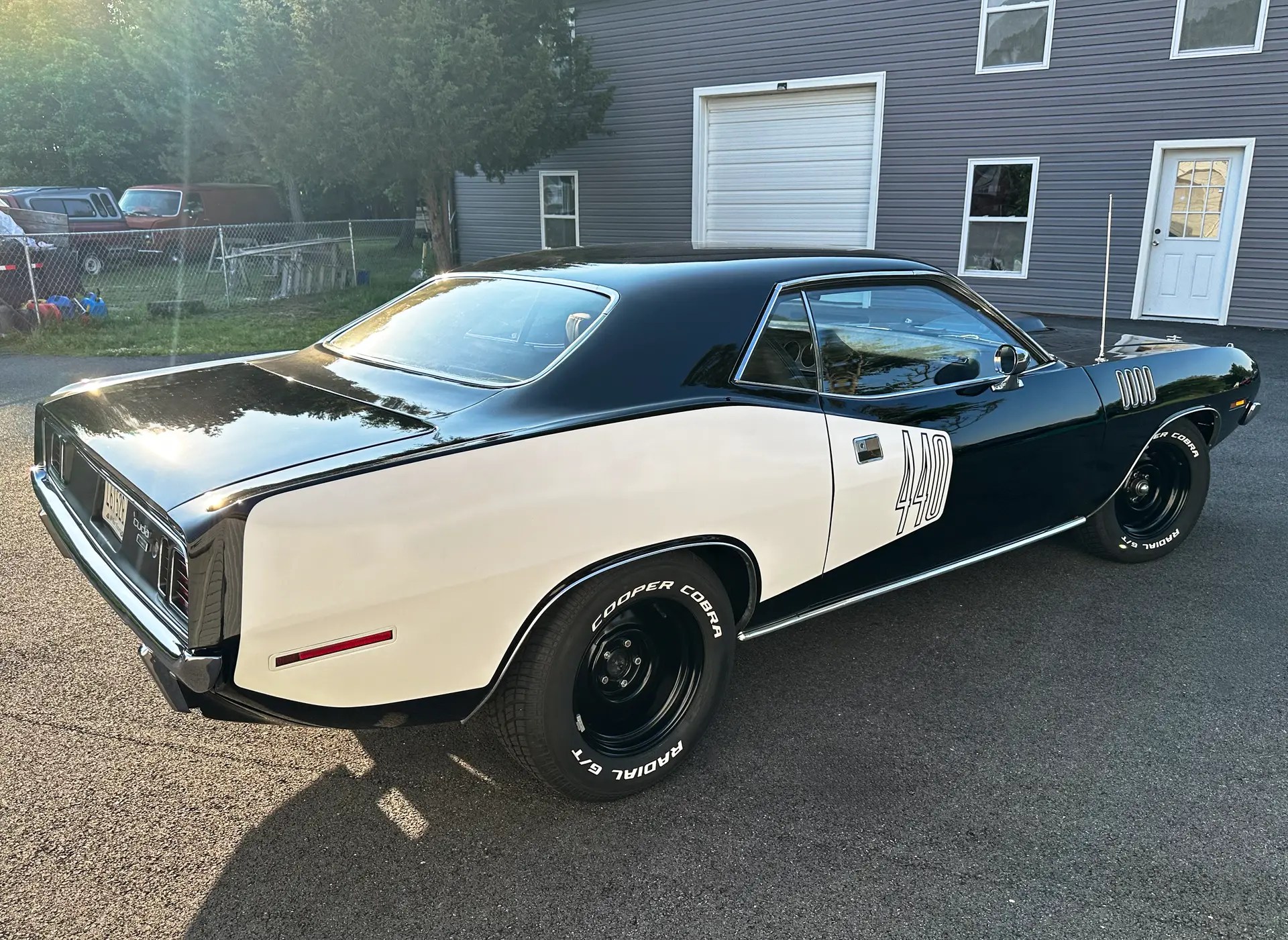 1971 Barracuda, originally a G code 318 car, now upgraded with a FiTech EFI 440+6 setup. It was born FE5 Rallye Red but has been repainted in TX9 black, accented by white 440 billboard decals.