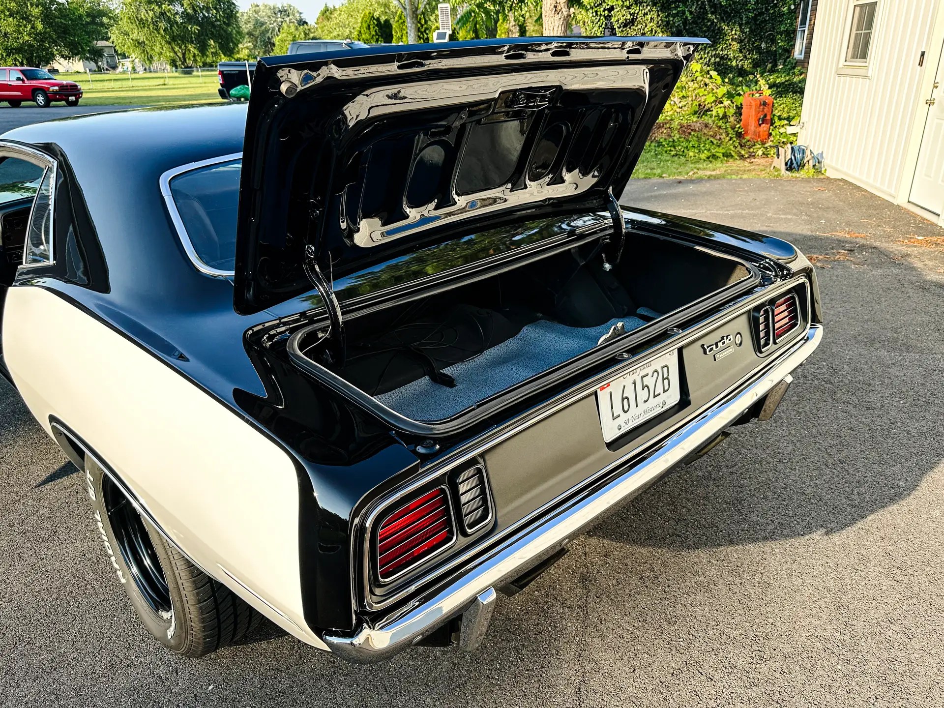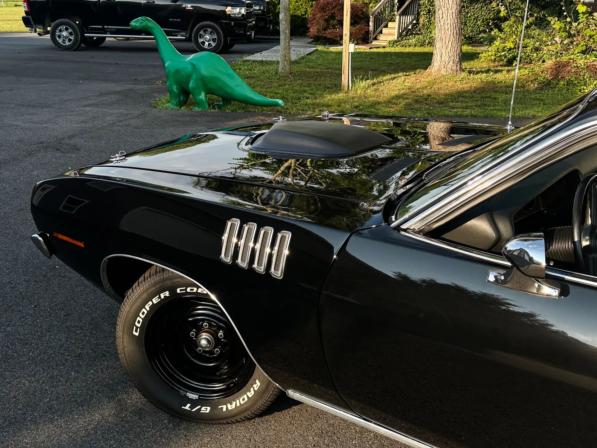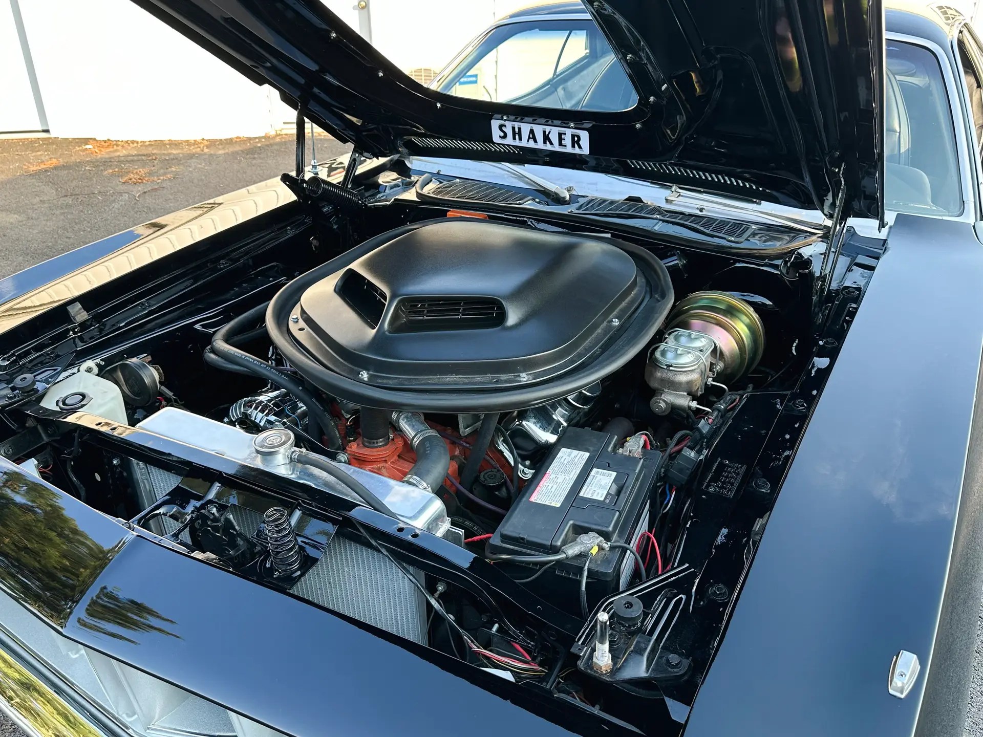 New AMD Cuda Fenders were installed and new fender gills added on. An AMD Shaker hood was added to the setup along with a complete reproduction Shaker assembly.