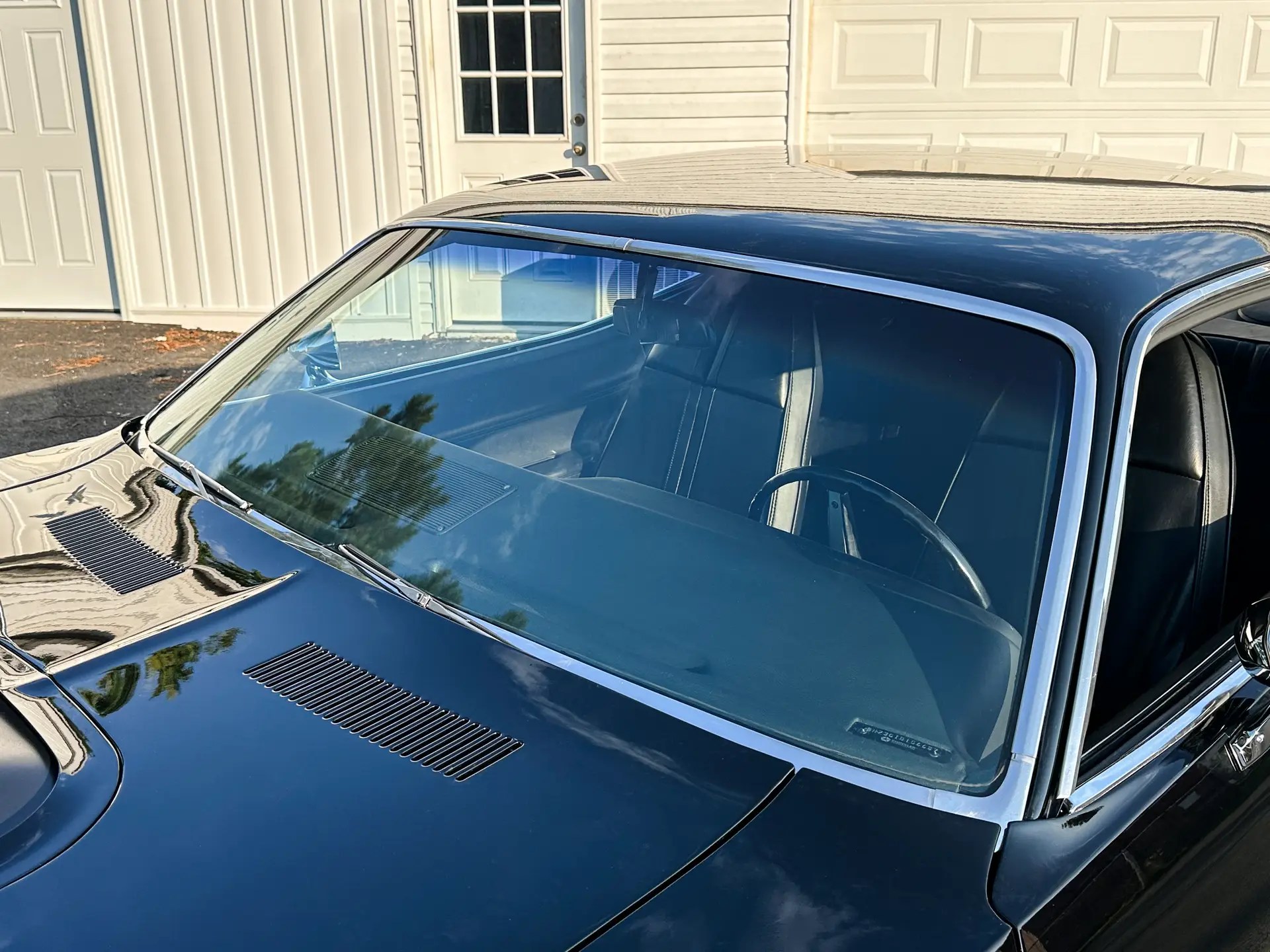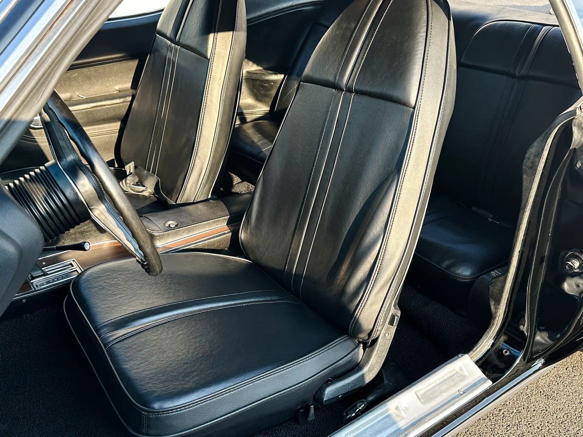 The interior has been fully redone with new seat foam, seat covers, headliner, carpet, dash pad, and fresh cluster and console decals. The dash retains the original VIN tag and factory rivets.